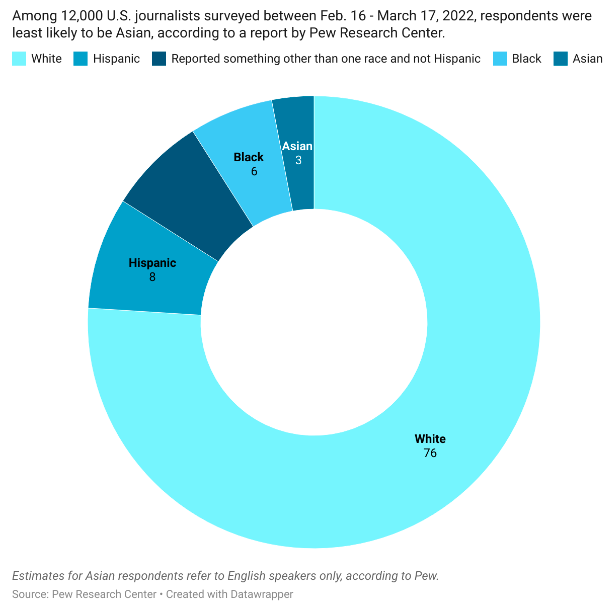 That’s the percentage of reporters who self-identified as Asian in Pew Research Center’s survey of 12,000 journalists in the U.S. Across most coverage areas—such as politics, business, health, entertainment, and sports—reporters were least likely to be Asian.